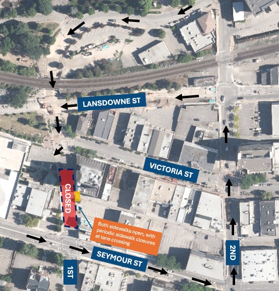 June 2: For one day, there will be a broader closure of 1st Avenue between Seymour Street and Landsdowne Street from 8:00 am to 6:00 pm. The added closure (northbound lane between Victoria Street and Lansdowne Street) will not impact westbound traffic on Lansdowne Street. The alley between Seymour Street and Lansdowne Street will remain accessible from 2nd Avenue. A small portion of the north lane off Seymour Street between 1st and 2nd Avenue will also be closed this day.