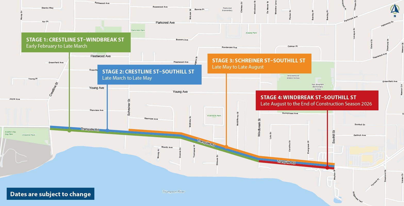 Learn more about project sequencing, timelines, and traffic/transit impacts, visit LetsTalk.Kamloops.ca/TranquillePhase3.