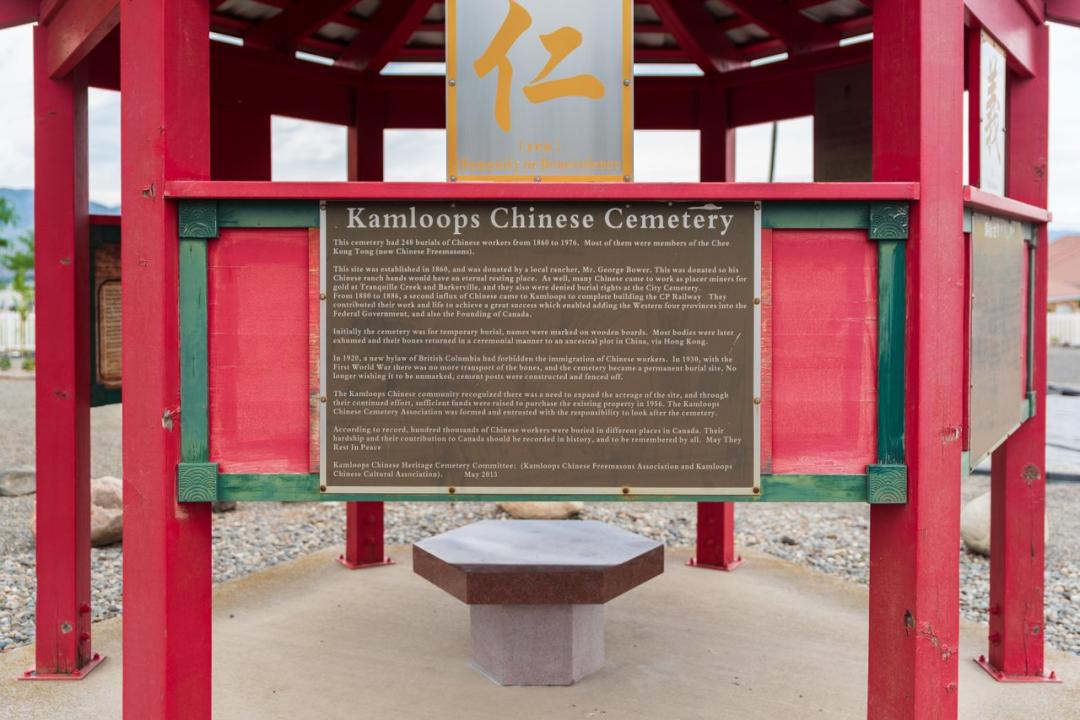 The Kamloops Chinese Cemetery is further valued as symbolic of the transition of the Chinese community from temporary to permanent in the 1920s, and as one of Canada’s largest and oldest intact Chinese cemeteries. The majority of Chinese immigrants in Kamloops were temporary, Sentinel in 1887, the Kamloops Chinese Cemetery was set up by the Chinese as a temporary burial place. As Chinese were banned from burying their deceased in the Pioneer Cemetery, the Hudson’s Bay Company allowed the Chinese to select a burial site on land that they owned south of town. The site was demarked by a wooden picket fence, and a stone altar and burner were placed at the north end of the cemetery. Graves were unmarked until after the Chinese Exclusion Act of 1923, when Chinese began to settle permanently in Kamloops. This is clearly reflected with the introduction of permanent, marked tombstones, the first of which occurred in 1927. Most marked graves date from the 1930s to the 1960s; the Chinese Cemetery was closed in 1979. The site now contains approximately 125 burial plots, over 50 of which were disinterred.