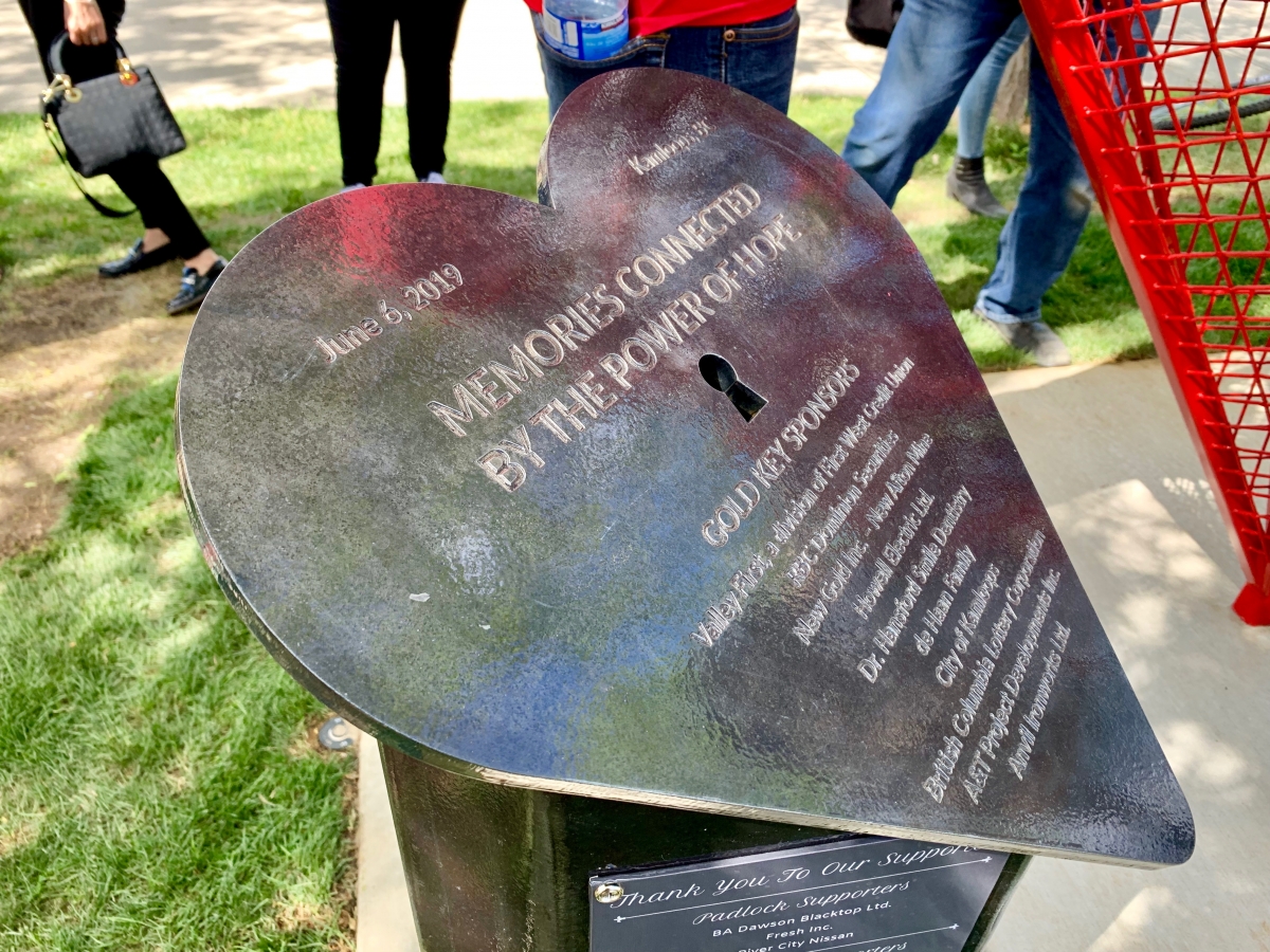 The newest public art installation was unveiled in Riverside Park on June 6. Locking in Hope is a partnership between the Kamloops Food Bank and the City of Kamloops and has served as a fundraiser for the Kamloops Food Bank. The iron heart and letters were created by Anvil Ironworks of Kamloops, and took over 250 hours to construct.
